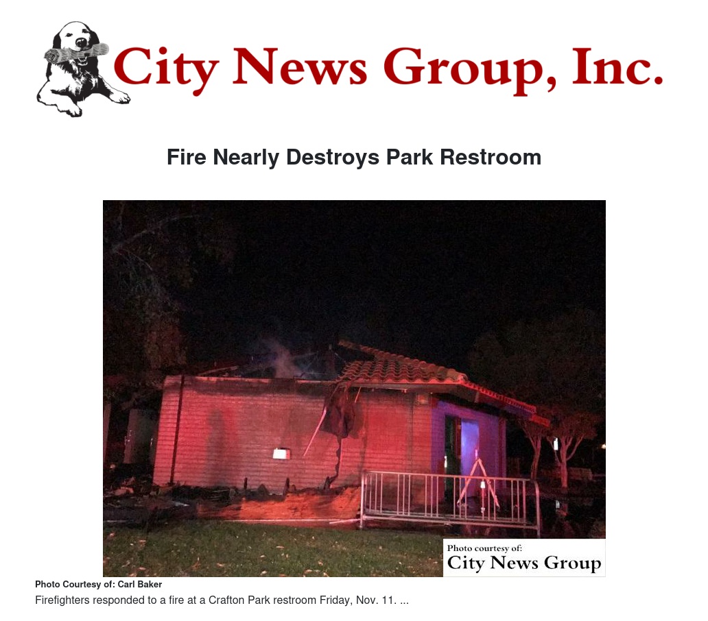 REDLANDS>> A park restroom building was severely damaged in an early morning fire Friday, Nov. 11 at Crafton Park in the 500 block of Wabash Avenue.