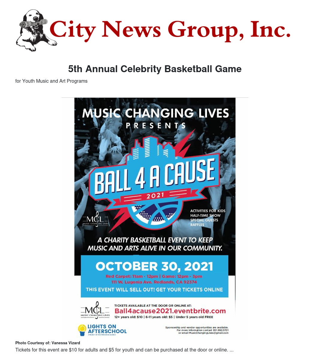Music Changing Lives (MCL) will host their 5th annual “Ball 4 A Cause.” A celebrity basketball game to support their music and arts program for local youth while joining thousands of communities rallying nationwide for Lights On Afterschool. The game will take place at the Redlands Community Center, located at 111 W. Lugonia Ave. Redlands, CA 92374 on Saturday, October 30, 2021 from 11am-3pm.