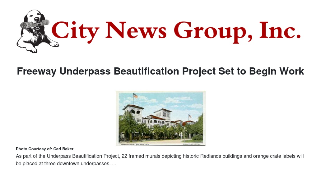 The project will beautify the underpasses at Eureka Street, Orange Street and Sixth Street, considered the gateways to the downtown area from Interstate 10. Improvements to be constructed as part of the project include installation of frames with 22 murals depicting historic citrus labels and historic Redlands buildings, painting of the underpass walls and replacement of existing lighting with energy efficient LED lighting. Each of the murals will include an anti-graffiti film.