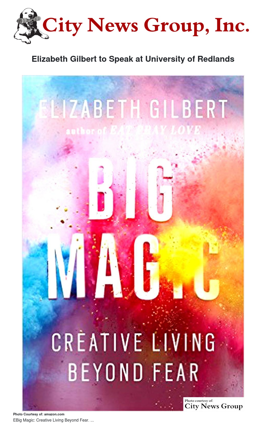 “We had to wait until now, but it’s actually really perfect timing, as her new book is released just before she arrives in Redlands,” she said. “She’ll be speaking on the creative process, a topic she’s discussed in two brilliant TED talks that I’ve shown to several of the classes I’ve taught. The students have been deeply inspired by her and I’m thrilled we are bringing a speaker who will undoubtedly engage and ignite the audience of students, faculty, staff, and community members on Oct. 24.”