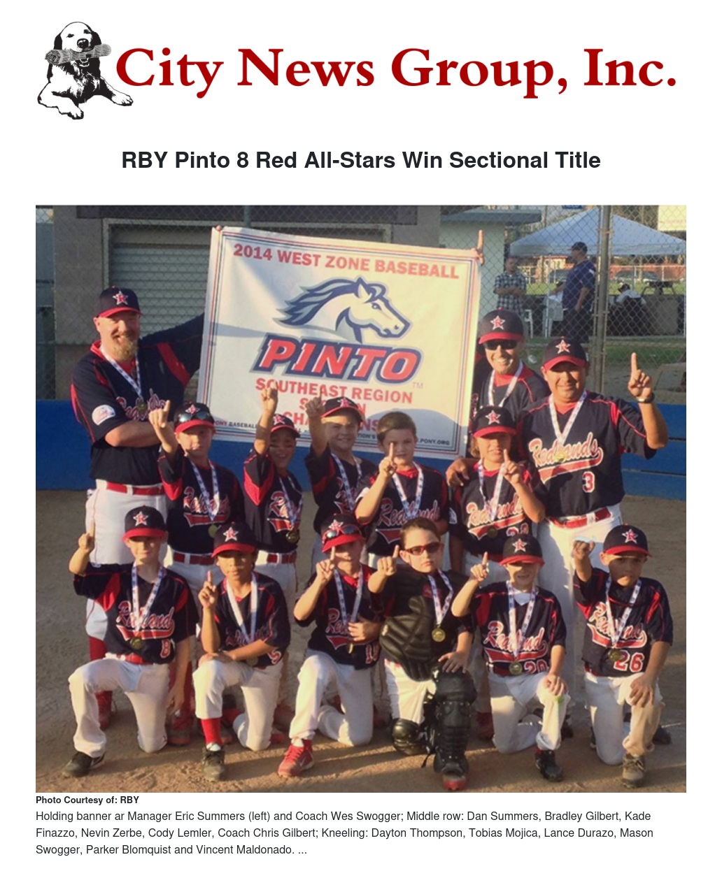 The next stop on the road to the PONY World Series in San Jose is the Regional Tournament. The RBY Pinto 8 have home field advantage as the tournament will place at the Community Fields (corner of San Bernardino Ave. and Church).
