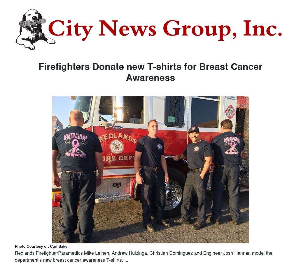 This marks the fifth consecutive year Redlands Firefighters have worn commemorative T-shirts through the month of October in an effort to increase awareness and raise funds to help fight breast cancer. Each year the Redlands Firefighters Association purchases the T-shirts with money donated from members. With the community’s support, the Redlands Professional Firefighters have donated a total of $19,000 to the charity.