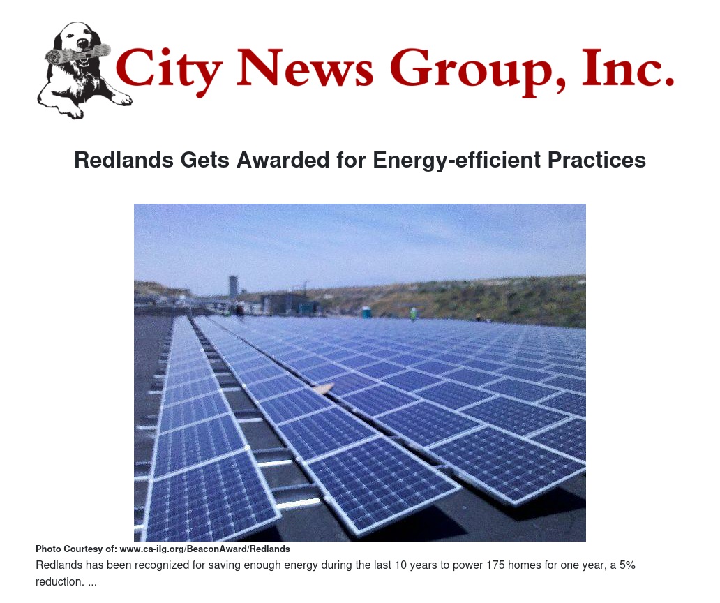 The city was recognized for achieving 5 percent electricity savings in agency facilities and operations since 2004, saving more than 1.1 million kWh, enough electricity to power approximately 175 average California homes for a year. Redlands was also awarded for completing at least one best practice activity in each of the Institute’s ten sustainability best practice areas.