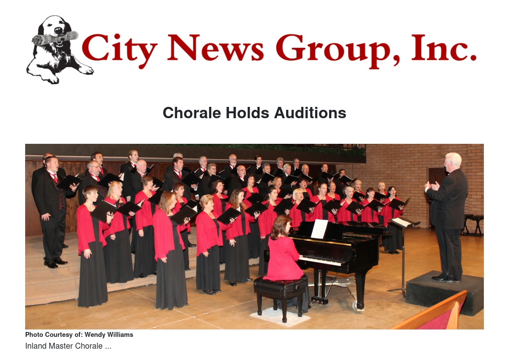Experienced singers interested in auditioning for the Inland Master Chorale are invited to attend open rehearsals on consecutive Mondays, Aug. 18 and 25. Auditions will be held by appointment on Wednesday, Aug. 27.