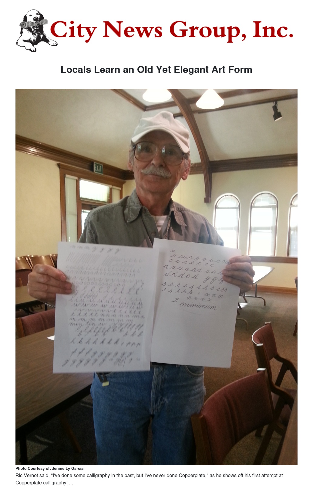 After a quick lesson on the countless uses of Copperplate calligraphy, Darwick began the class introducing her assistant for the day, Bill Bus, the only member of the Society for Calligraphy in the Redlands area.