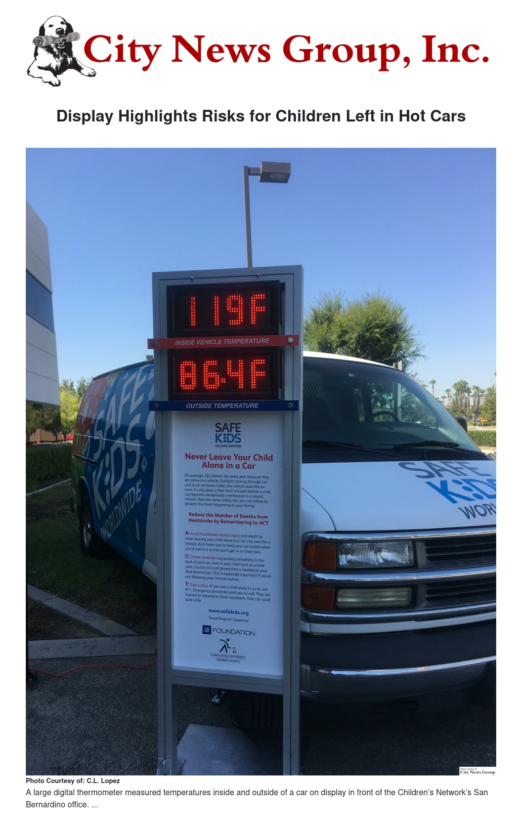 July 26 through 28 from 9 a.m. to 3 p.m., a large digital thermometer measured temperatures inside and outside of a car on display in front of the Children’s Network’s San Bernardino office. The display was part of the County’s continuing efforts to prevent children from being left alone inside of hot vehicles.