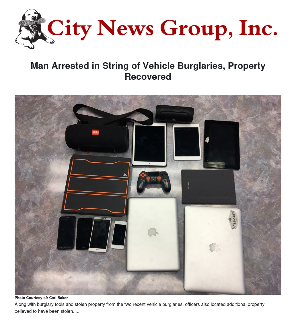 Detectives have connected a man arrested for breaking into cars in downtown Redlands with at least six vehicle burglaries since July in Redlands and San Bernardino and recovered thousands of dollars in stolen property. Investigators believe the suspect is responsible for additional vehicle burglaries over the past several months.