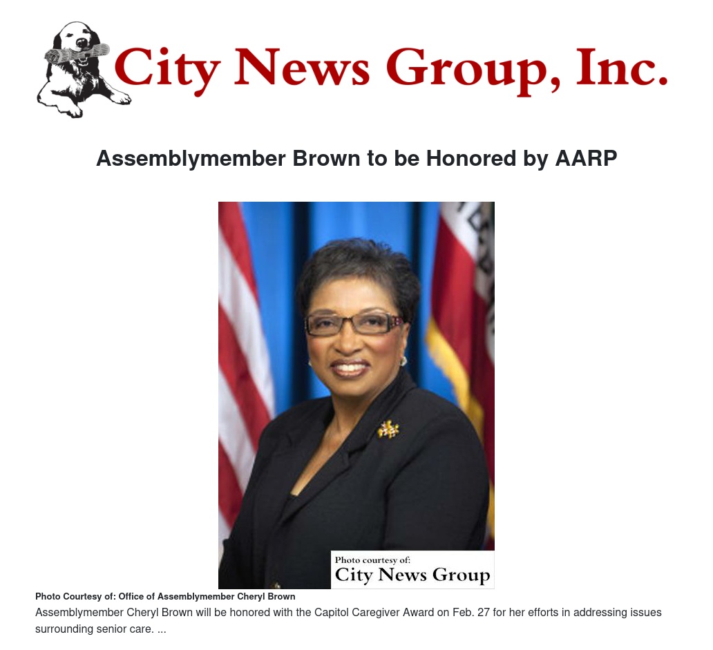 Assemblymember Cheryl R. Brown will be honored with The Capitol Caregiver Award by the American Association of Retired Persons (AARP) on Friday, Feb. 27, in Fontana. The award will be given by AARP California State President Patricia Perez.