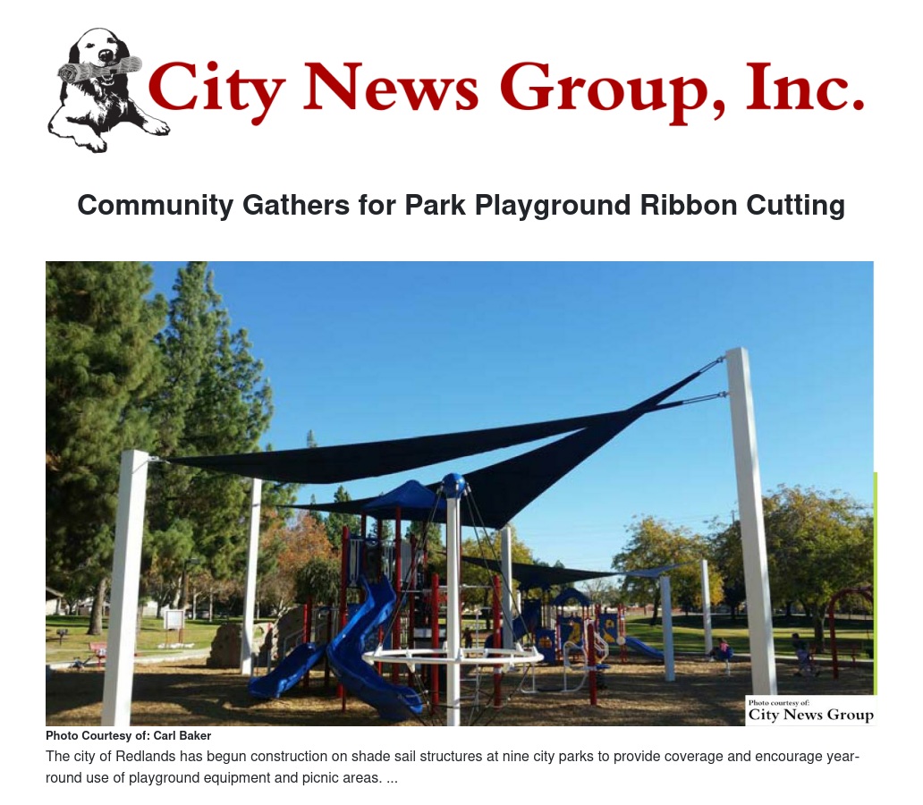 The City of Redlands has begun construction on shade sail structures at nine city parks to provide coverage and encourage year‐round use of playground equipment and picnic areas.