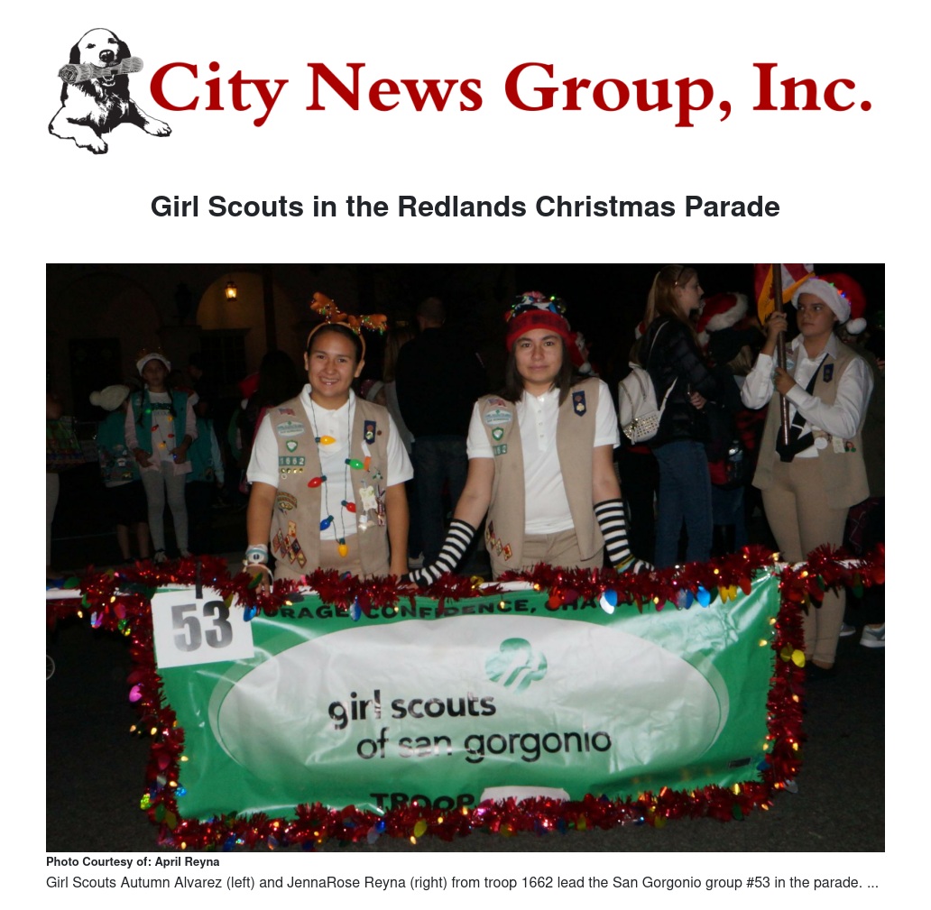 Walking in the Redlands Parade was a great opportunity for the Girl Scouts. They were able to display their sisterhood and how they come together. The troops wanted to show parade goers just how great it is to be a Girl Scout with their enthusiasm and holiday spirit in hopes of sparking interests in other girls possibly wanting to become a Girl Scout. All of the San Gorgonio service troops enjoyed this opportunity and are hoping to keep it going next year.
