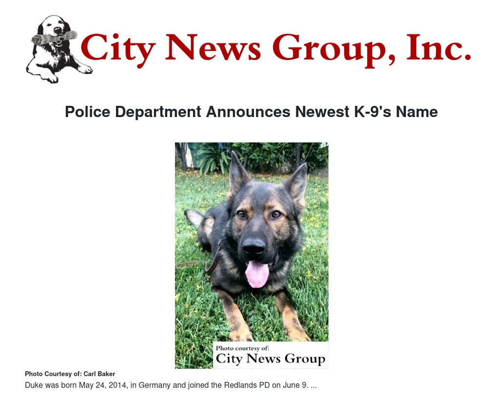 Duke was named after a two-week contest asking residents to suggest names for the department’s newest K-9. Mia Griggs, a school teacher and 12-year resident of Redlands, submitted the winning entry. Griggs will have an opportunity to meet and have her picture taken with both RPD K-9s and their handlers.