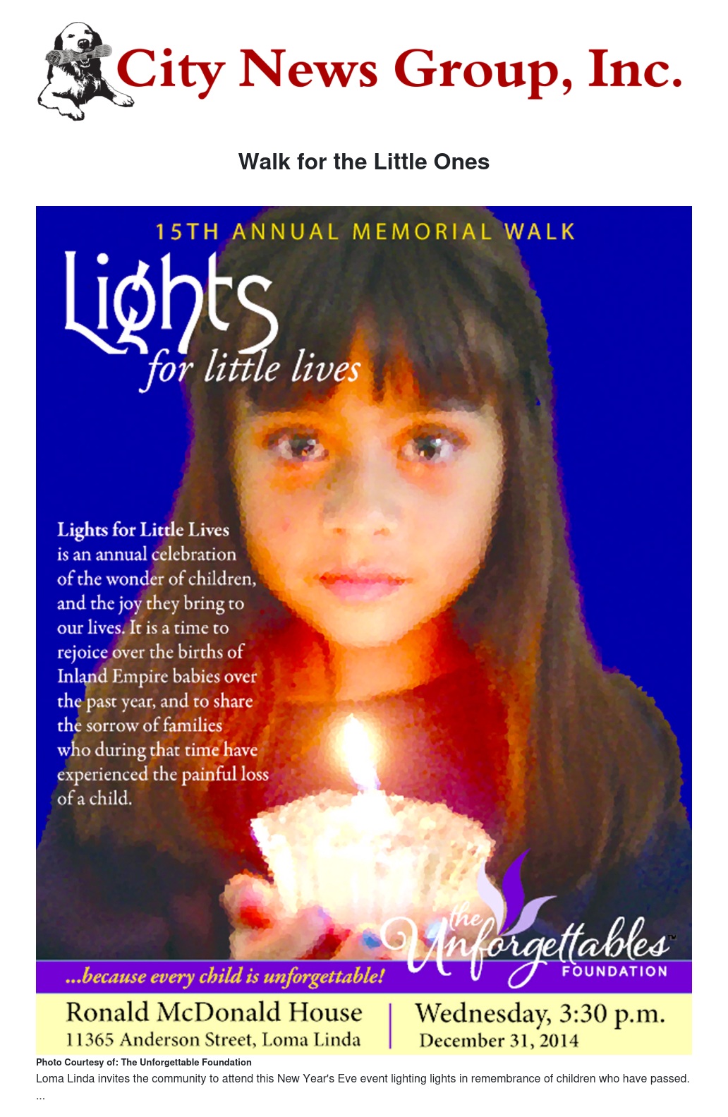 The 15th annual Lights for Little Lives Memorial Walk will take place on Dec. 31 in Loma Linda.