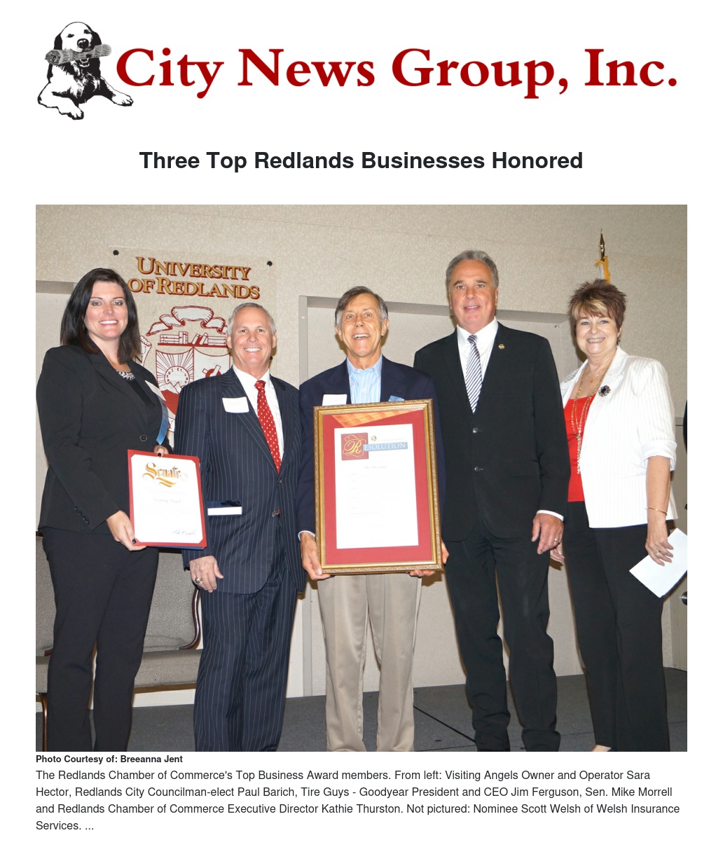 Redlands' Tire Guys - Goodyear, Welsh Insurance Services and Visiting Angels were recognized as leaders in their community by State Sen. Mike Morrell Nov. 21 at the University of Redlands during the 4th Annual Top Chamber Business Awards.