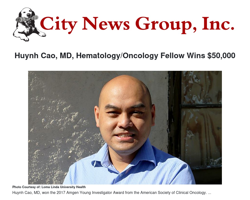 Huynh Cao, MD, a third-year hematology/oncology fellow at Loma Linda University Health Education Consortium, was recently named recipient of the prestigious 2017 Amgen Young Investigator Award from the Conquer Cancer Foundation of the American Society of Clinical Oncology. The $50,000 stipend that accompanies the award will help finance Cao’s study of a novel mechanism for killing leukemia cells by delivering high doses of Vitamin D to the bone marrow of patients with the fast-growing cancer.