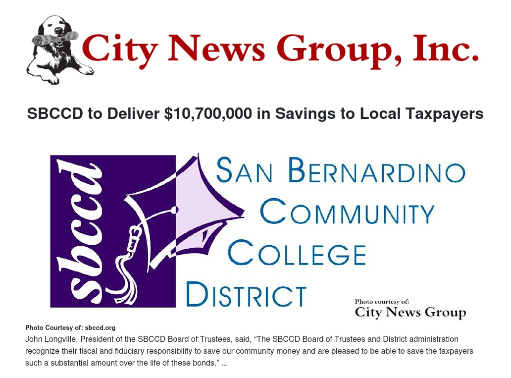 This was the second time that the San Bernardino Community College District took the initiative to deliver savings to its community. In April 2013, the district did a similar bond refinancing and saved local taxpayers a total of $11.5 million.