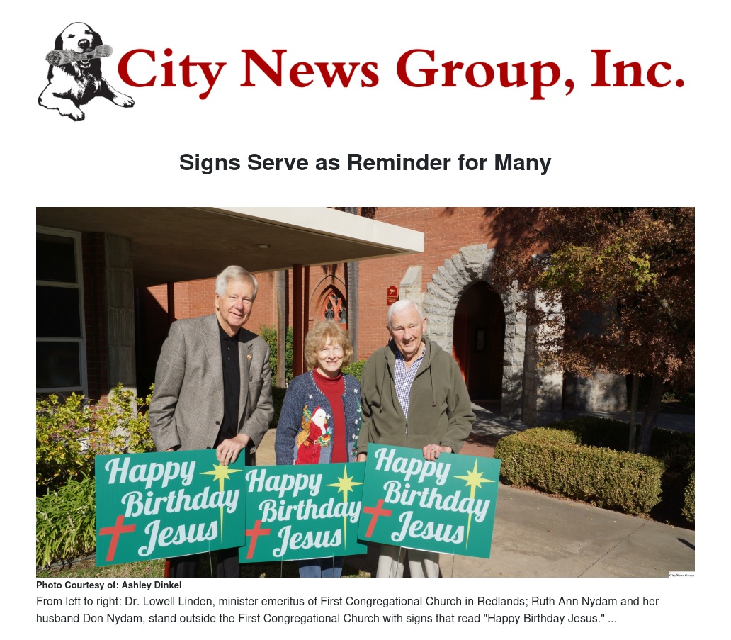 The story of the signs goes back four years ago when a men’s bible study group in Redlands felt that a lot was being done to take Christ out of Christmas and wanted to make a statement. Together, they came up with the “Happy Birthday Jesus” signs.