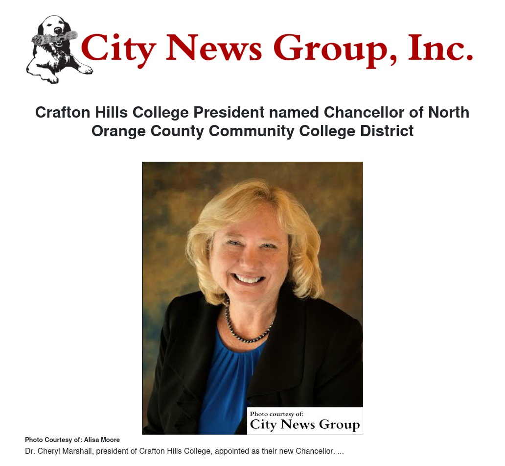 The North Orange County Community College District (NOCCCD) Board of Trustees recently announced that Dr. Cheryl Marshall, the president of Crafton Hills College (CHC) in the San Bernardino Community College District (SBCCD) has been appointed their new chancellor. She will assume the new position on July 1, after the appointment is formally approved by the board at their February meeting.