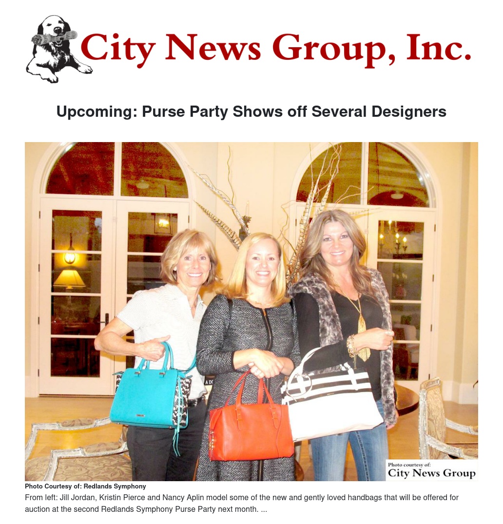 The Redlands Symphony Purse Party starts at 5 p.m. and will be held at the home of Jill and Matt Jordan, located at 328 W. Mariposa in Redlands.