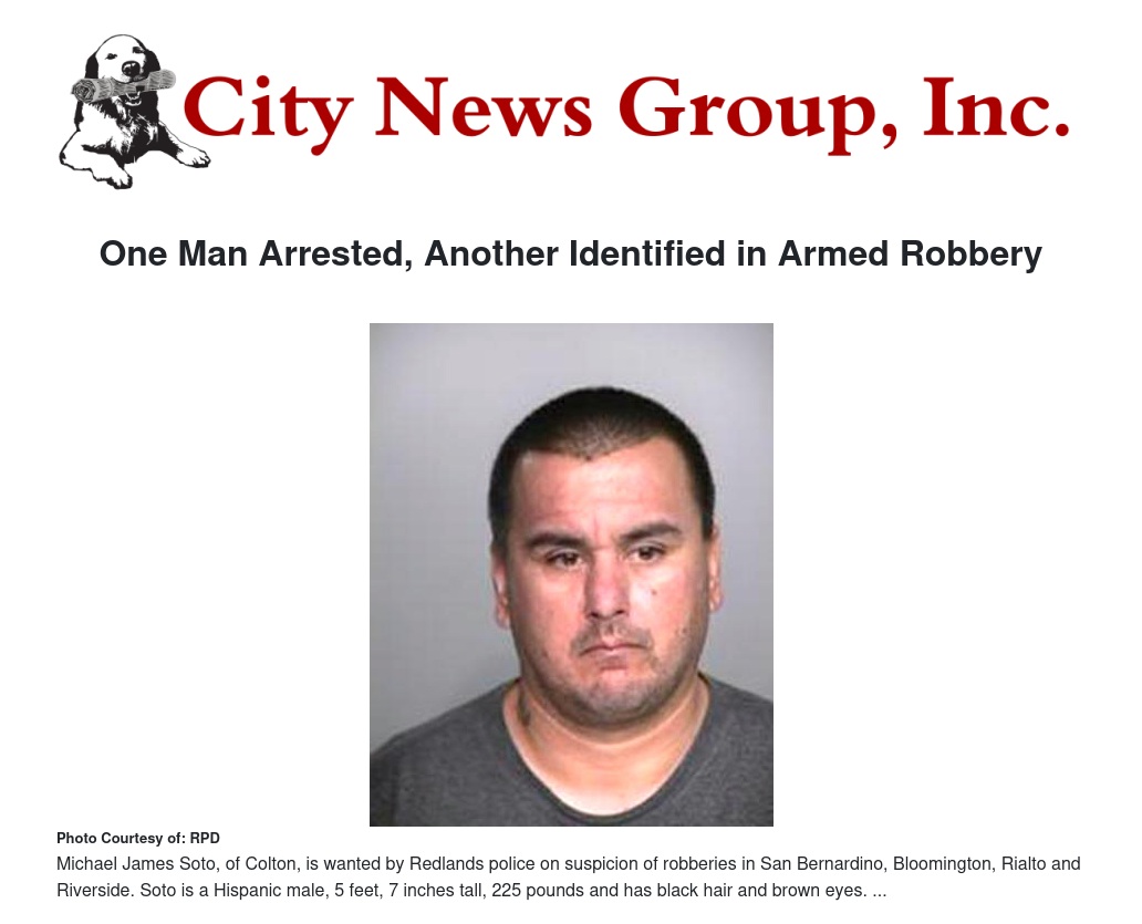 Police have identified the second suspect as Michael James Soto, 39, of Colton. In addition to the Redlands robbery, detectives believe Soto and Colunga are responsible for similar robberies in San Bernardino, Bloomington, Rialto and Riverside.