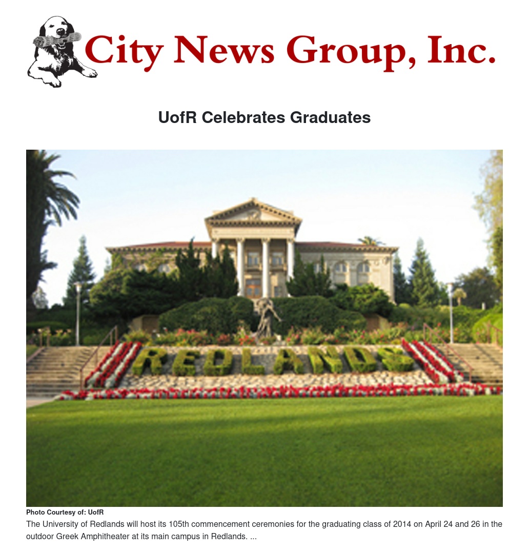 The University of Redlands will host its 105th commencement ceremonies for the graduating class of 2014 on April 24 and 26 in the outdoor Greek Amphitheater at its main campus in Redlands. More than 1,600 students from the College of Arts and Sciences, School of Business and School of Education from all University of Redlands branch campuses in southern California will participate in the commencement ceremonies. Members of the University of Redlands faculty will also be recognized as part of the Commencement activities.