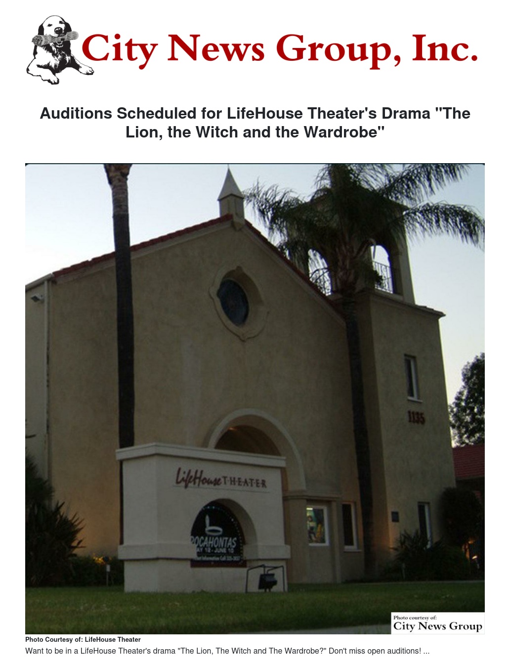 Auditions Scheduled for LifeHouse Theater's Drama "The Lion, the Witch and the Wardrobe"