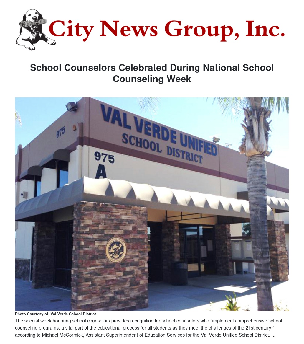 The special week honoring school counselors provides recognition for school counselors who "implement comprehensive school counseling programs, a vital part of the educational process for all students as they meet the challenges of the 21st century," according to Michael McCormick, Assistant Superintendent of Education Services for the Val Verde Unified School District.