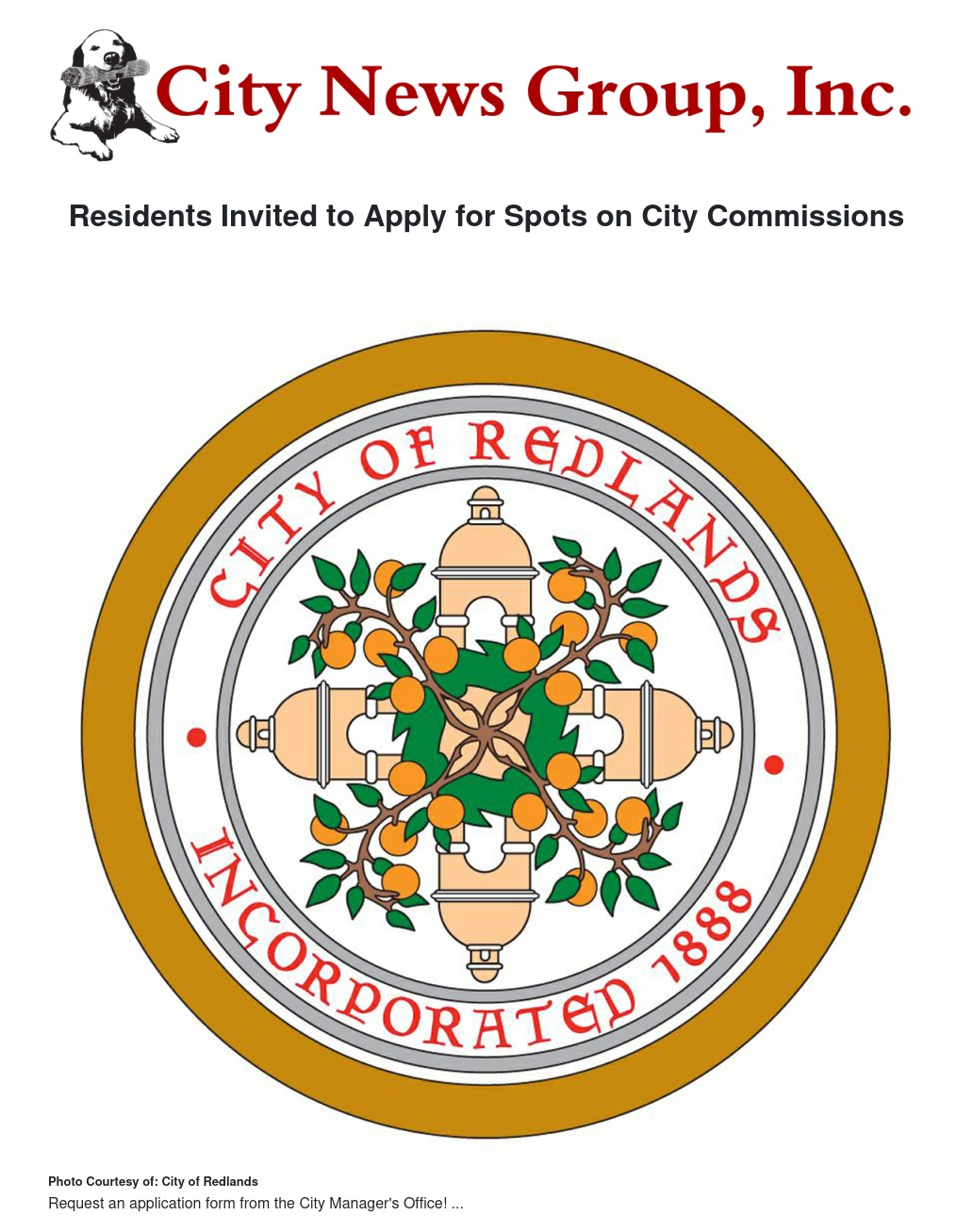 The City of Redlands currently has openings on three City commissions. Deadline for filing applications to any of the three commissions is May 6. Commissioners are appointed by the City Council. Except where noted, commission meetings are held in the Redlands City Council Chambers, 35 Cajon St.