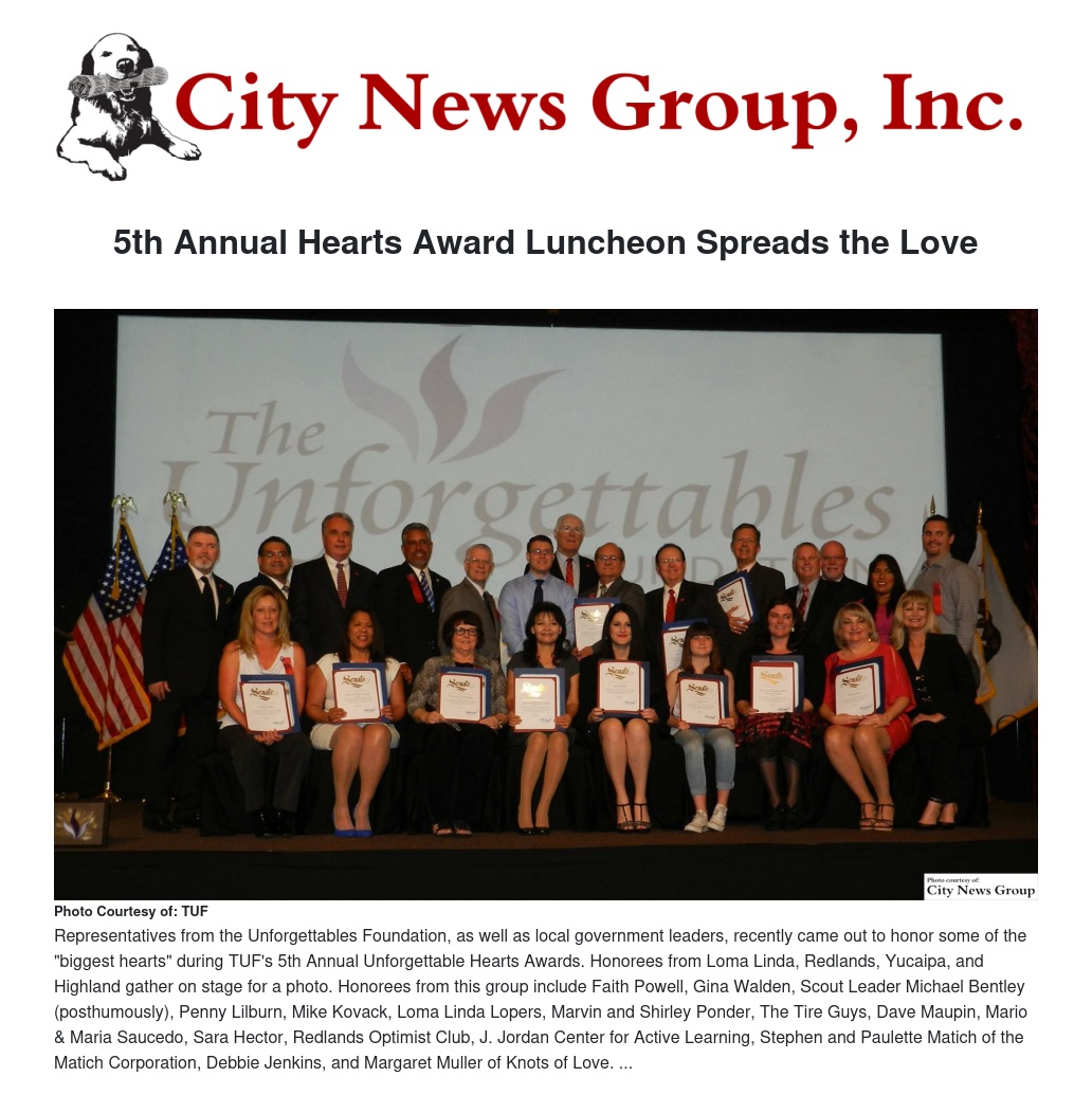 The Unforgettables Foundation (TUF) kicked off Valentine’s Day weekend by recognizing and awarding those community members, leaders, and organizations that exude selflessness and possess the “biggest hearts” of all throughout the Inland Empire at their 5th Annual Unforgettable Hearts Awards luncheon on Friday, Feb. 12. A myriad of community members filled the Fox Event Center in Redlands to enjoy a three-course meal, courtesy of the founder of the Fontana Foundation of Hope and event honoree Jack Long. All event attendees received a large welcome from TUF co-founder, Tim Evans. "The purpose from the beginning, when Senator Mike Morrell and I conceived of the idea, was to celebrate big-hearted individuals and the good work people do. It was also to show that charities can share and work together, collaborate and cross promote, and as a little charity, we decided to prove and highlight that point. We've been able to bring attention to over 100 sister charities in the five years of this event," said Evans. Host of the heart-warming event, TUF is a non-profit organization that provides care and support, financially and emotionally, for those families that have unfortunately lost a child. Over the course of 16 years, TUF has helped over 5,000 Southern California families with essential burial and funeral funds for children — 18 years to 32 weeks gestation. Event keynote speaker Senator Mike Morrell reminded everyone the good that TUF does by offering life-changing support for families of children whose lives were tragically cut short. As he thanked all of the hard working non-profit organizations and charities, he shared: “So many organizations, there are so many needs.. and you have these people, and a lot of these business owners, taking their own money and helping people within our community.. and that’s the way it’s always been meant to be,” he said. “This San Bernardino massacre.. it was bitter sweet, the bitterness of course of all those people that lost their lives but our community really came together in those weeks afterward and I was proud to represent the 23rd Senate District.” TUF Board Member, Stan Morrison, who served as the event's emcee, shared his thoughts on the organization and explained why he choose to get involved: "As the father of two and the grandfather of four, I pray that I will never be confronted with the agony of having to bury a child or a grandchild. The Unforgettables Foundation, where I have the honor of serving as a Board member, fully grasps my initial thought here. Going one step further, The Unforgettables Foundation aids families that do not have the finances to provide a dignified burial for their lost child. Imagine, amidst the incredibly heart wrenching pain of losing a child, coming to the realization that you cannot afford to bury that same child with dignity. If our culture is built, in large part, on teaching others to “give back”, this organization is the most obvious and compelling example of doing just that. Helping people whom you may never meet or see and who can do nothing for you may be the ultimate gift. The Unforgettables Foundation, under the leadership of Founder and Pastor Tim Evans, and a magnificent volunteer Board, does exactly that." Morrison began by presenting one of the highest awards, the Unforgettable Summer Austin Award. The honorable accolade was named after the daughter of John and Judy Austin who, 19 years ago this winter, was killed at the young age of 20. After learning of TUF from The Bobbitt funeral home, John and Judy called Tim Evans and they have served an instrumental role in TUF ever since. Their decade of giving financially, and of time, has helped pave the way for more and more lives to be touched. The award was given to two very rewarding parties: Paul and Nina Adkins, and Dr. Tomas D. Morales. Paul and Nina Adkins are very committed to the child and veteran support efforts in the Inland Empire. Not only are they well-known advocates for military families and causes like the Medal of Honor, P.O.W.s, Riverside National Cemetery Support Committees, and West Coast Thunder; beyond that they have been annual donors to TUF for over a decade — both personally and through their Compressor Component Part Company — for total contributions of over $20,000. Dr. Thomas D. Morales, the President of Cal State San Bernardino (CSUSB), was elected as such in May 2012. In addition to his role at CSUSB, Morales is a board member of the American Association of State Colleges and Universities, became the organization's chair in 2014, and serves as vice chair of the governing board of the Hispanic Association of Colleges and Universities. He has received the Latino Trendsetter Award at the United Nations, was named number one of the 100 Most Influential Latino Leaders in America; and has worked with TUF for the past three years, facilitating the annual Children & Families in Crisis Conference at the CSUSB Palm Desert Campus. The WeCARE Award is honored to a business or entity that has helped the organization immensely. Evans presented this award to Dave Davisson, a manager with DaVita Dialysis Clinics of the Inland Empire. Hearing about TUF five years ago, Davisson and the DaVita team have wasted no time serving as cheerleaders for the organization, encouraging community members to donate and get involved. The global dialysis organization of nearly 50,000 employees at over 2,000 international sites has over 30 clinics in the Inland Empire. To date, the DaVita team has donated almost $20,000 to the Unforgettables. “The best way I can describe the Unforgettables if someone asked what it’s all about…it’s a loving financial shoulder for people to lean on during their time in need,” Davisson added. Many local leaders also participated in the event. Congressman Pete Aguilar, who served as one of the event hosts, said, “The Unforgettables Foundation provides an incredible service to Inland Empire fam