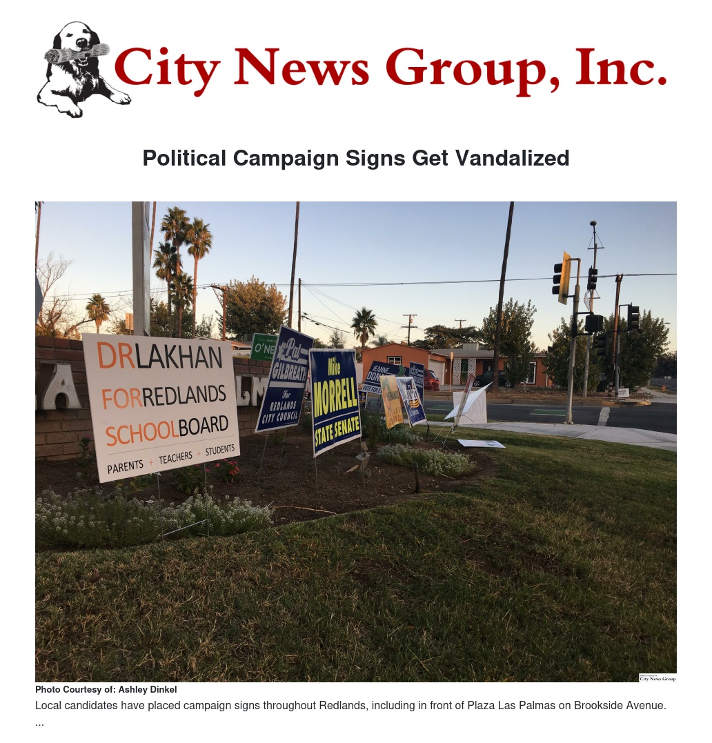 REDLANDS>> On. Oct 2, Dr. Shaheen Lakhan, Redlands Unified School District Governing Board candidate, was driving near the intersection of California Avenue and Barton Road when he noticed one of his campaign signs was vandalized.