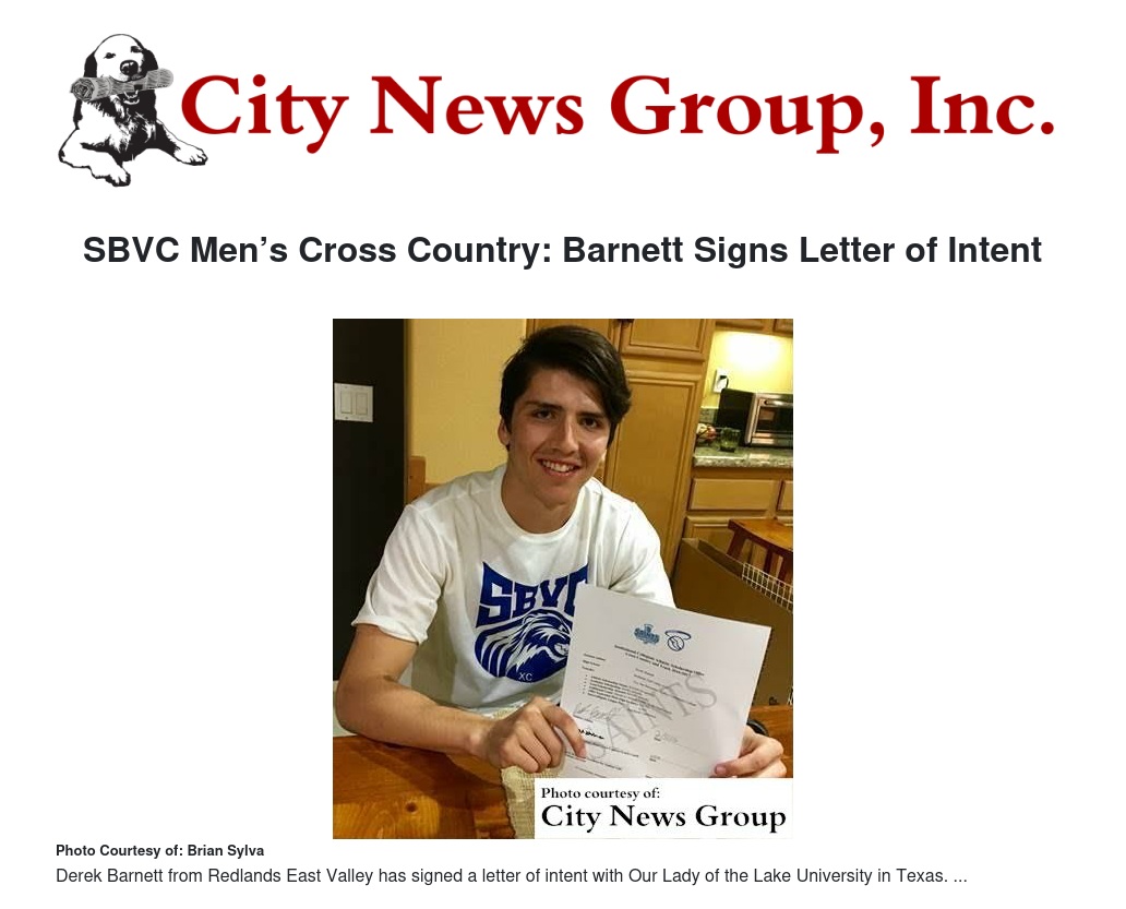 SBVC Men’s Cross Country and Men’s Track and Field sophomore Derek Barnett (Redlands East Valley) has signed a letter of intent with Our Lady of the Lake University in Texas.