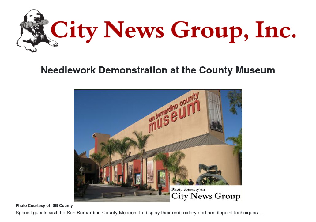 Members of the Inland Empire Chapter of the Embroiderers Guild of America will demonstrate and display embroidery and needlepoint techniques on Sunday, April 17 from 10 a.m. to 3 p.m. at the San Bernardino County Museum. The local Embroiderers Guild chapter has met at the museum monthly since the 1990s to inspire interest in the craft and to introduce it to the next generation.