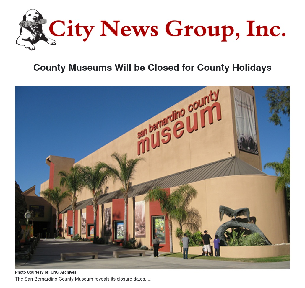 The San Bernardino County Museum will be closed on official county holidays during this year’s holiday season. The closure dates are also in effect for San Bernardino County Museum historic sites and branches, including the Asistencia in Redlands, Agua Mansa Cemetery in Colton, the Yucaipa Adobe in Yucaipa, the John Rains House in Rancho Cucamonga, the Yorba and Slaughter Adobe in Chino, and the Victor Valley Museum in Apple Valley.
