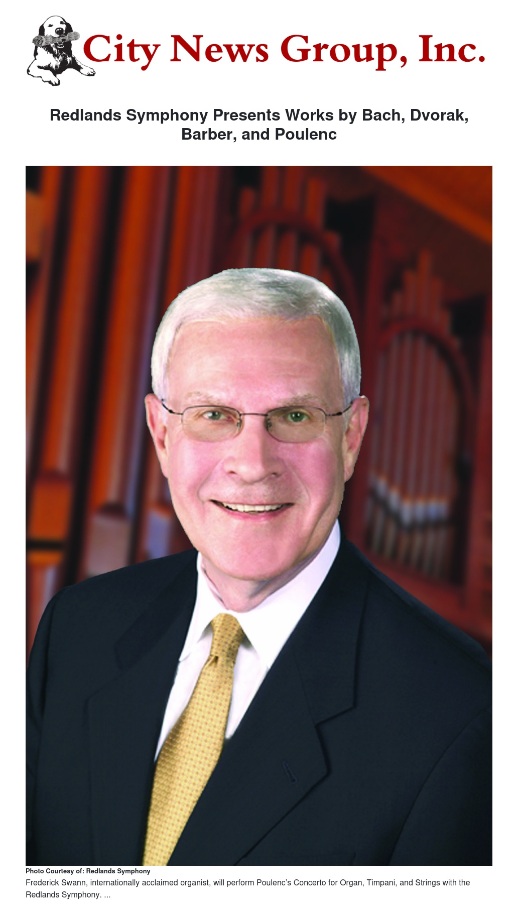 “I am elated that Frederick Swann has agreed to perform the Poulenc with our Redlands Symphony Orchestra,” says Robertson, “Putting this wonderful organ in the hands of a master like Fred Swann becomes something close to divine. This will be an evening that our audience will remember for a long time.”