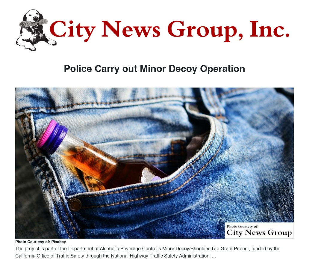 This project is part of the Department of Alcoholic Beverage Control’s Minor Decoy/Shoulder Tap Grant Project, funded by the California Office of Traffic Safety through the National Highway Traffic Safety Administration.