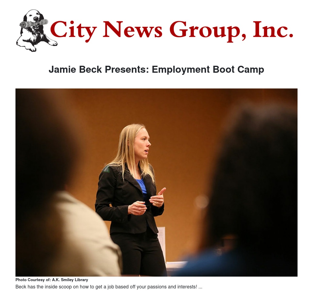 Jamie Beck will present an Employment Boot Camp from 1 to 5 p.m. Wednesday, March 5th in the Assembly Room of the A.K. Smiley Public Library, 125 W. Vine St., Redlands.