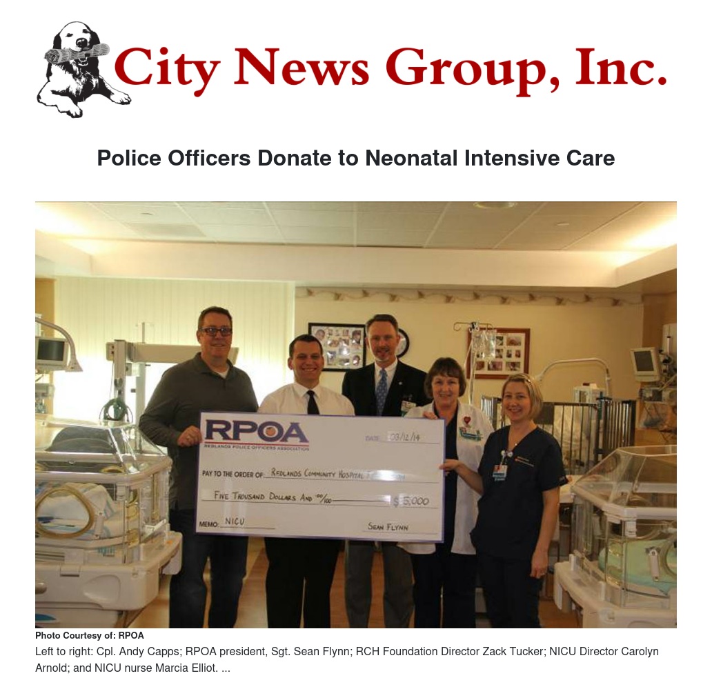 For the past two years, the Redlands Police Officers Association has partnered with the Mu' Restaurant Golf Tournament Committee to raise almost $30,000 in donations, which the RPOA charitable foundation donated to local organizations and charities that support and provide services to youth in the community. In addition to the RCH Foundation, recipients have included AYSO, Redlands Baseball for Youth, March of Dimes, San Bernardino Sexual Assault Services, Special Olympics, Boys and Girls Club, athletics programs at each of the high schools in the Redlands Unified School District, Micah House, and the Children’s Cancer Foundation of Southern California.
