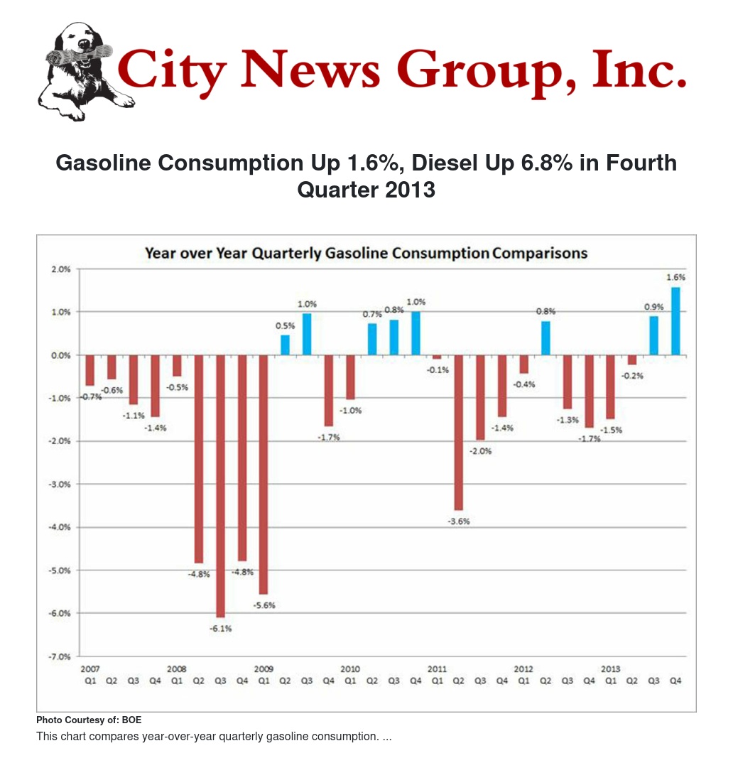 California’s gasoline consumption rose 1.6% in the fourth quarter 2013, faster than any quarter since 2004, associated with relatively low prices during that period and an improving economy, according to data released today by California State Board of Equalization (BOE) Vice Chair Michelle Steel.