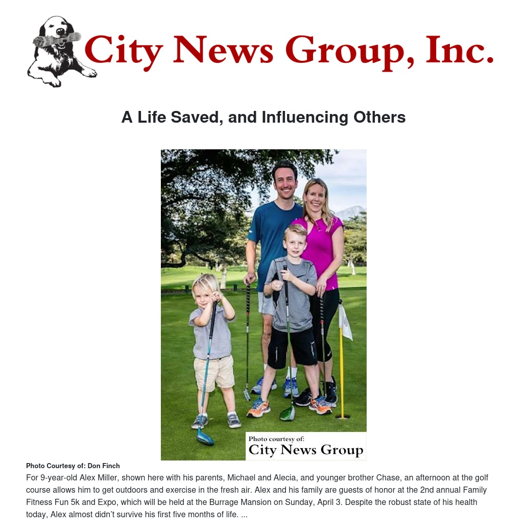 When 9-year-old Alex Miller joins his family to host the 2nd annual Family Fitness Fun 5k and Expo at the Burrage Mansion in Redlands on Sunday, April 3, the fact that the energetic young athlete almost didn’t survive his first five months of life won’t be apparent to anyone who doesn’t know the story.