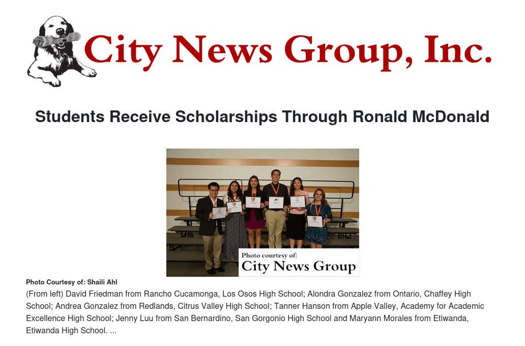SAN BERNARDINO >> Ten of San Bernardino County’s brightest high school seniors have been awarded college scholarships from Ronald McDonald House Charities of Southern California to help reduce the financial burden of college tuition, fees and other educational expenses.