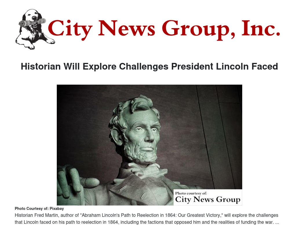 On Saturday, Nov. 7 at 2pm in the Lincoln Memorial Shrine, historian Fred Martin, author of "Abraham Lincoln's Path to Reelection in 1864: Our Greatest Victory," will explore the challenges that Lincoln faced on his path to reelection in 1864, including the factions that opposed him and the realities of funding the war.