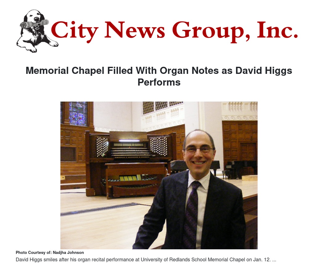 As part of the ongoing organ recital series hosted at the University of Redlands, music lovers filled the Memorial Chapel Sunday evening, Jan. 12, for David Higgs's performance.