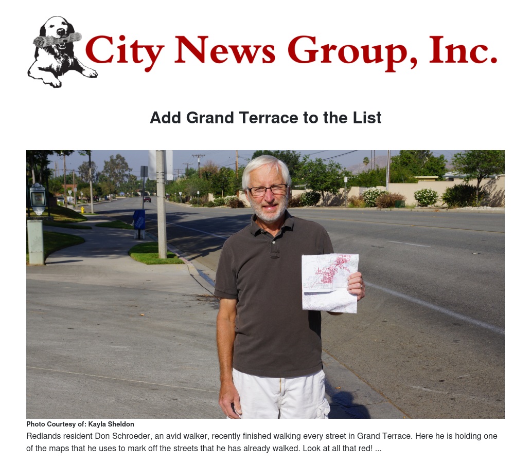 Redlands resident, Don Schroeder, has walked every street in Redlands, Yucaipa, Loma Linda, Highland, Calimesa, and has just recently added Grand Terrace to that list.