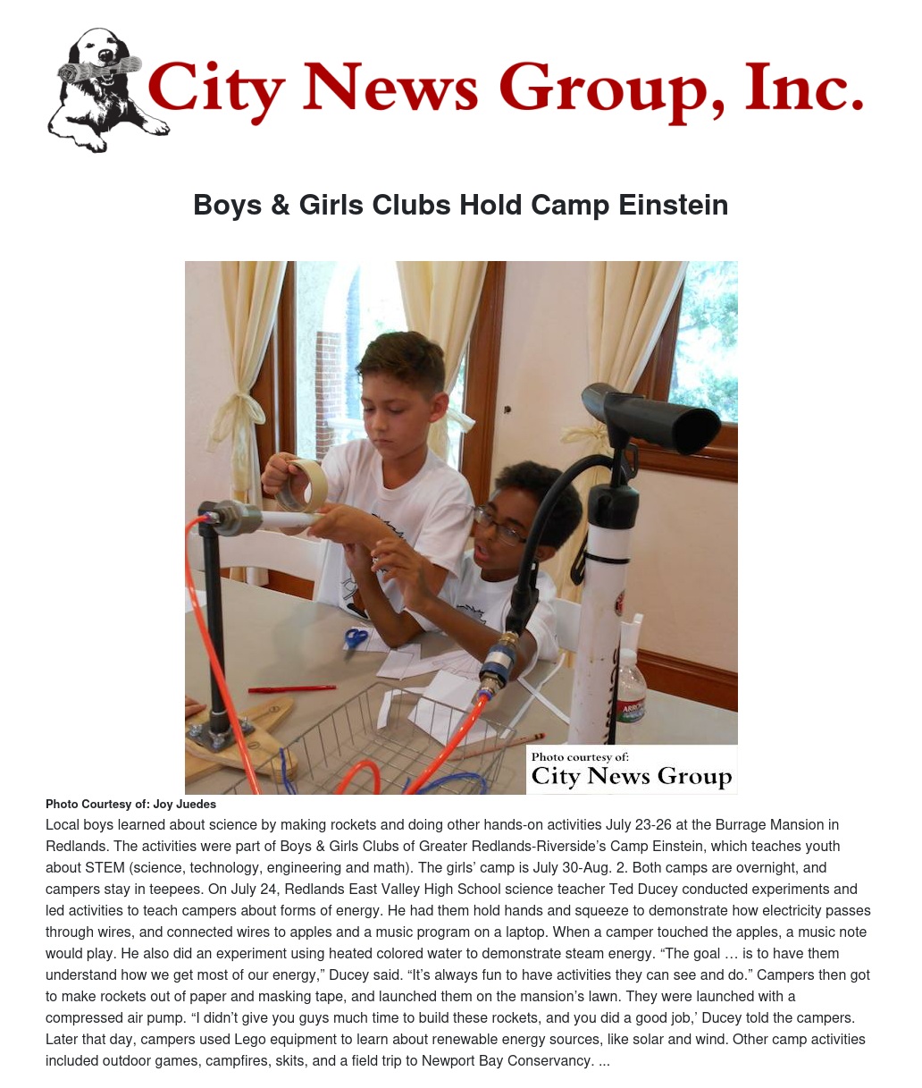 The activities were part of Boys & Girls Clubs of Greater Redlands-Riverside’s Camp Einstein, which teaches youth about STEM (science, technology, engineering and math).