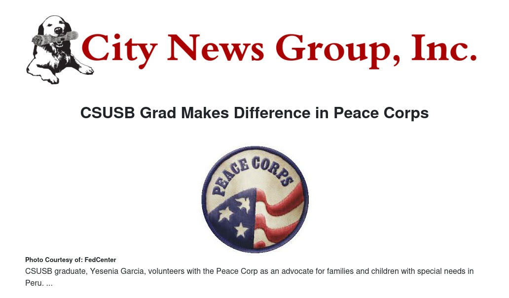 This past June, Cal State San Bernardino graduate, Yesenia Garcia, first set foot in Lima, Peru to begin her 27-month commitment serving in the Peace Corps.