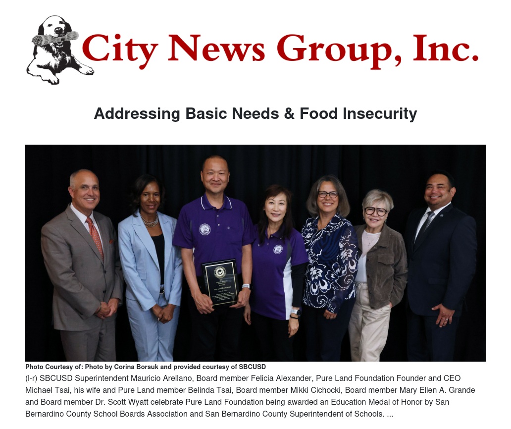 The San Bernardino City Unified School District (SBCUSD) is proud to announce that the nonprofit organization Pure Land Foundation has been awarded the prestigious Education Medal of Honor for its outstanding contributions to the community through its mobile food pantry initiative.