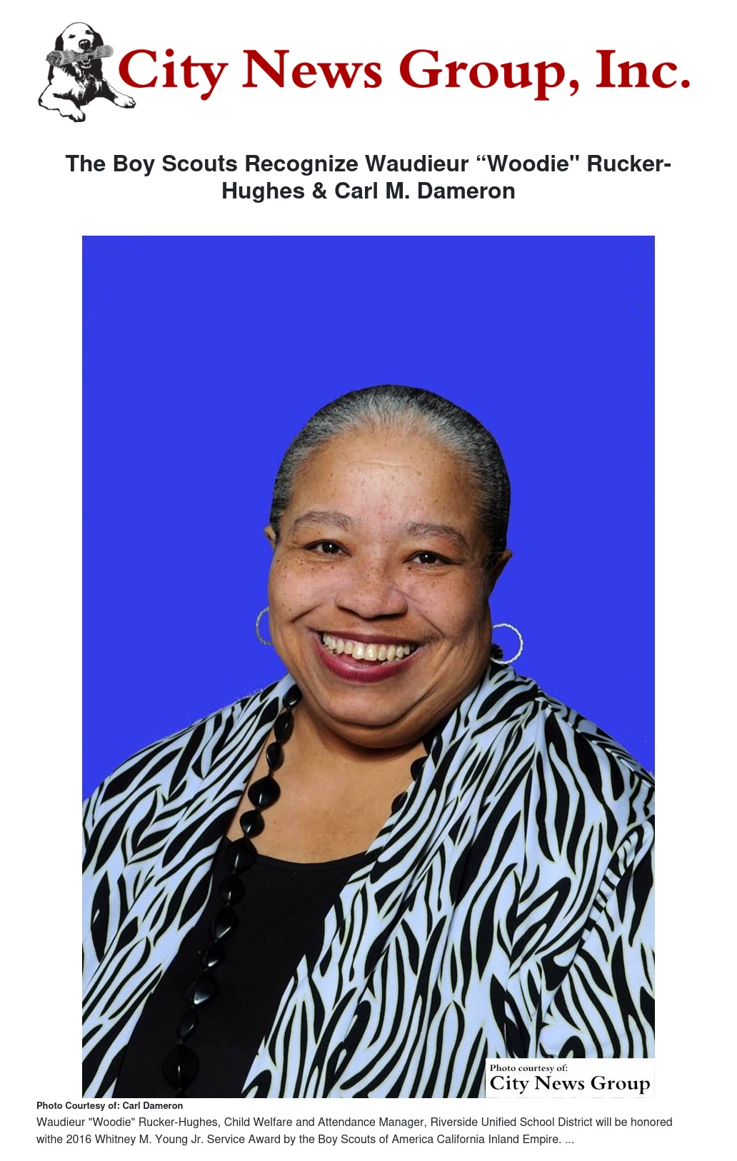 The Boy Scouts of America California Inland Empire will honor Waudieur "Woodie" Rucker-Hughes, Child Welfare and Attendance Manager, Riverside Unified School District and Carl M. Dameron, Creative Director, Dameron Communications. They are the 2016 Whitney M. Young Jr. Service Award Honorees.