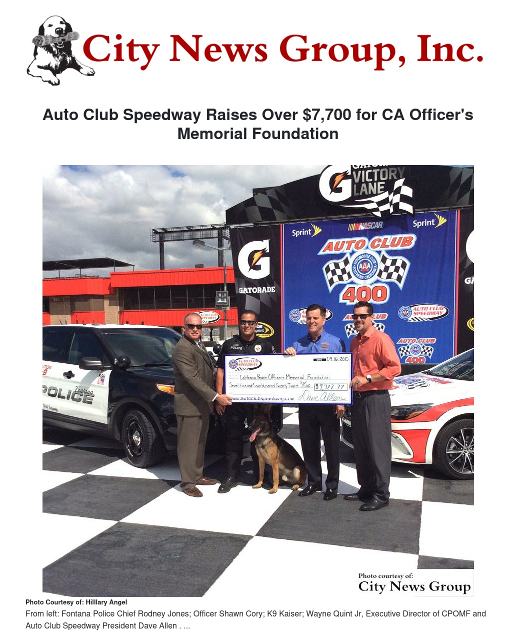 "This check speaks volumes about the relationship the first responders have with Auto Club Speedway,” said Quint. "Our fallen heroes families can rest assured that the officer’s legacy will live on."