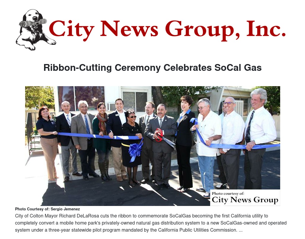 SoCalGas marked the completion of the first project with a ribbon-cutting ceremony at the Mt. Slover Trailer Village in Colton Nov. 6. Attendees included SoCalGas leaders, local and state elected officials, representatives from the CPUC, the owners of Mt. Slover, and mobile home park residents.