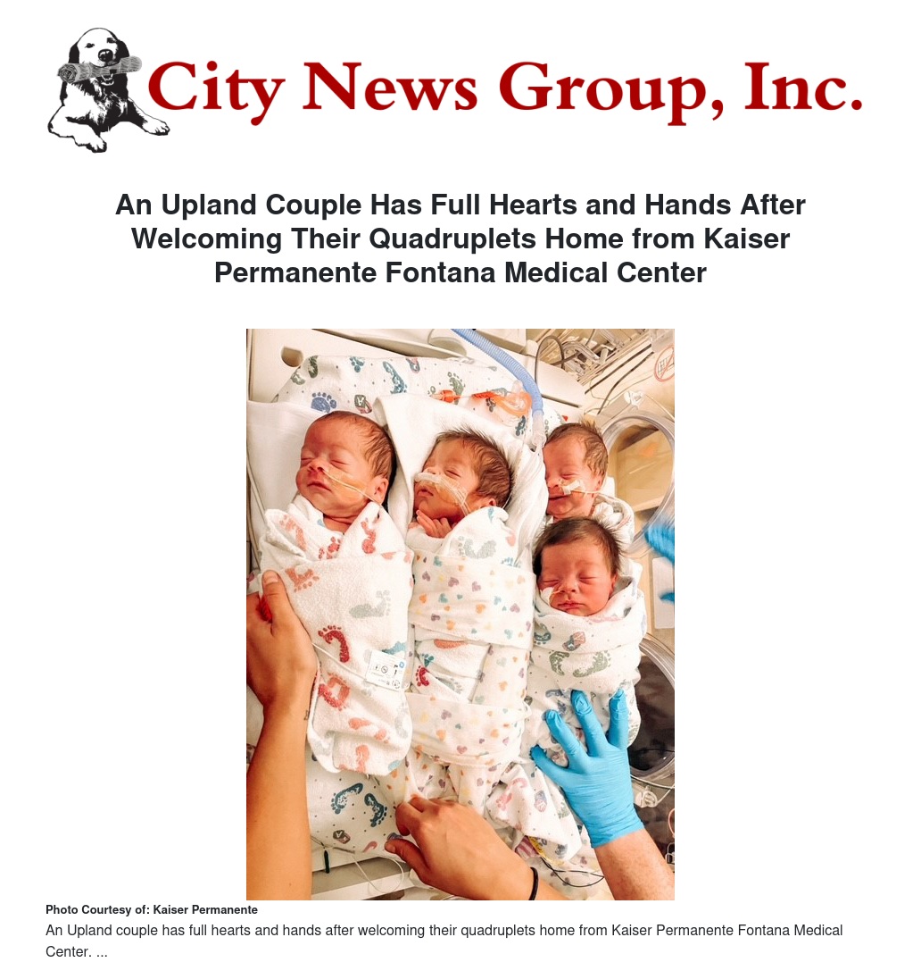 Multiple births – that’s twins, triplets, quadruplets, and beyond – are becoming more common as more couples turn to artificial methods of fertilization. An Upland couple has full hearts and hands after welcoming their quadruplets home from Kaiser Permanente Fontana Medical Center following a complex delivery, and a 6-week stay in the hospital’s Level III Neonatal Intensive Care Unit (NICU).