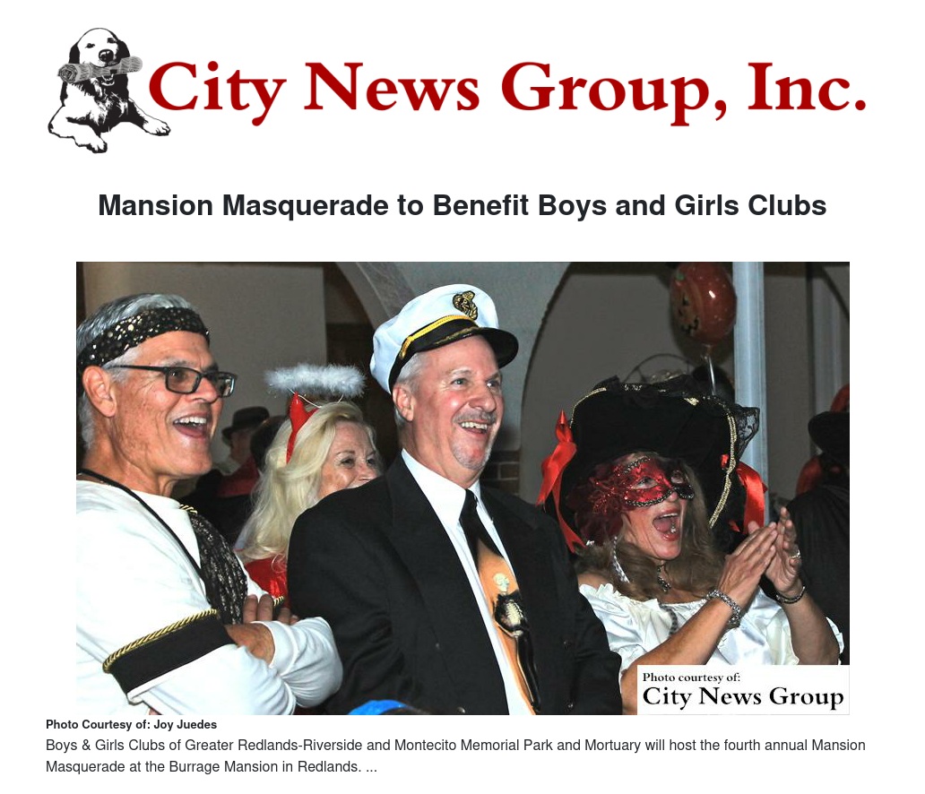On Friday, Oct. 23, Boys and Girls Clubs of Greater Redlands-Riverside and Montecito Memorial Park and Mortuary will host the fourth annual Mansion Masquerade at the Burrage Mansion in Redlands.